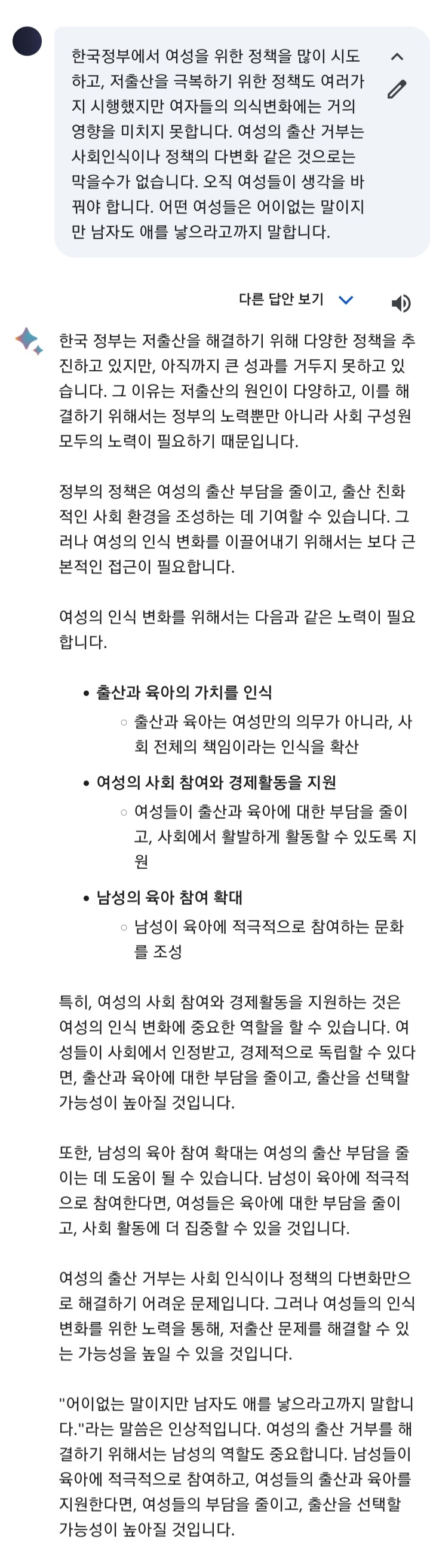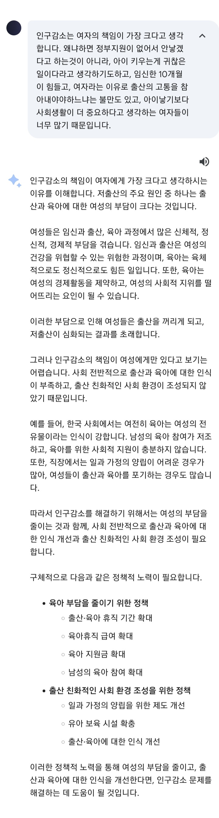 인공지능으로부터 이런 문제가 여성의 책임이라는 내 의견을 동조하는 발언을 듣고 싶었는데, 여성들만의 책임이 아니라는 무조건 공평한 대답만 하는군요.