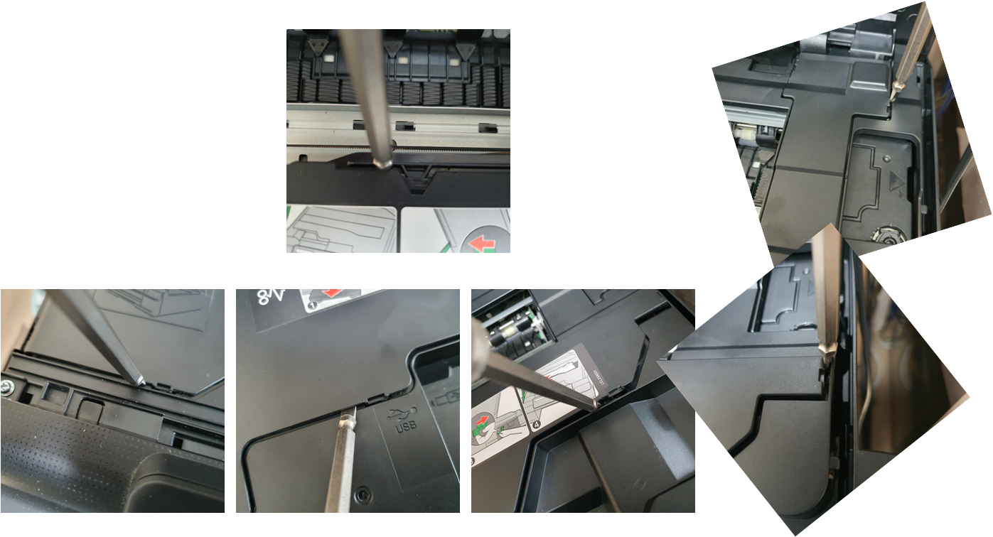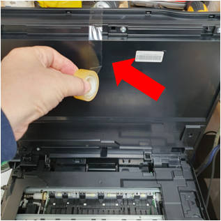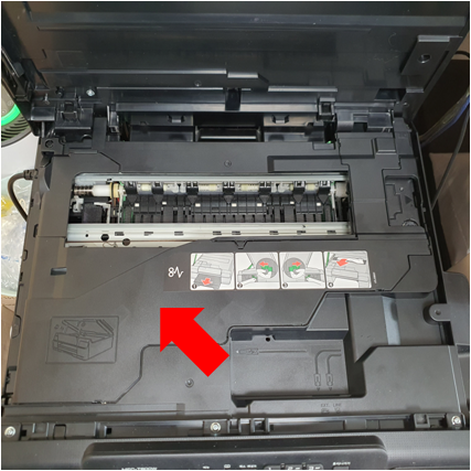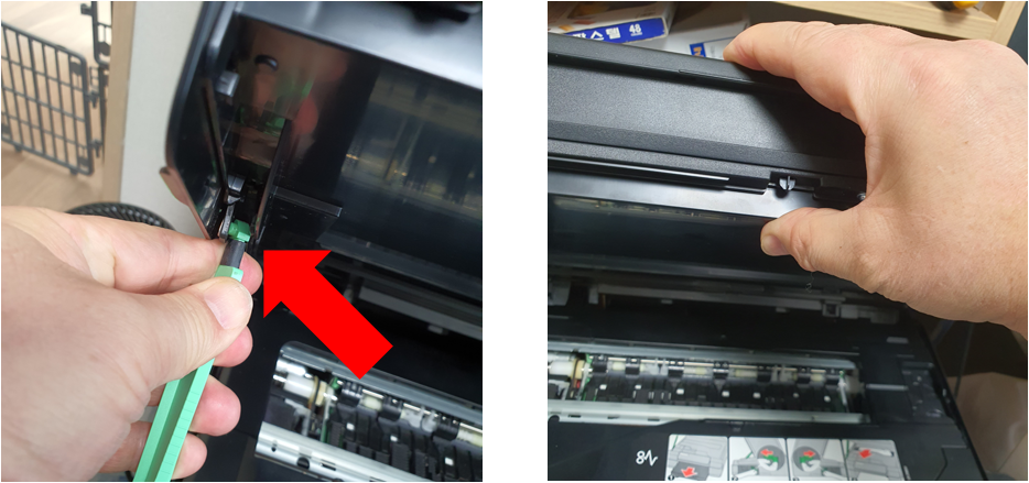4. 스캐너와 덮개를 열고 나면 본체 내부가 살짝 보이는데 여기를 덮고 있는 또 하나의 프라스틱 덮개를 분리해야 한다.
