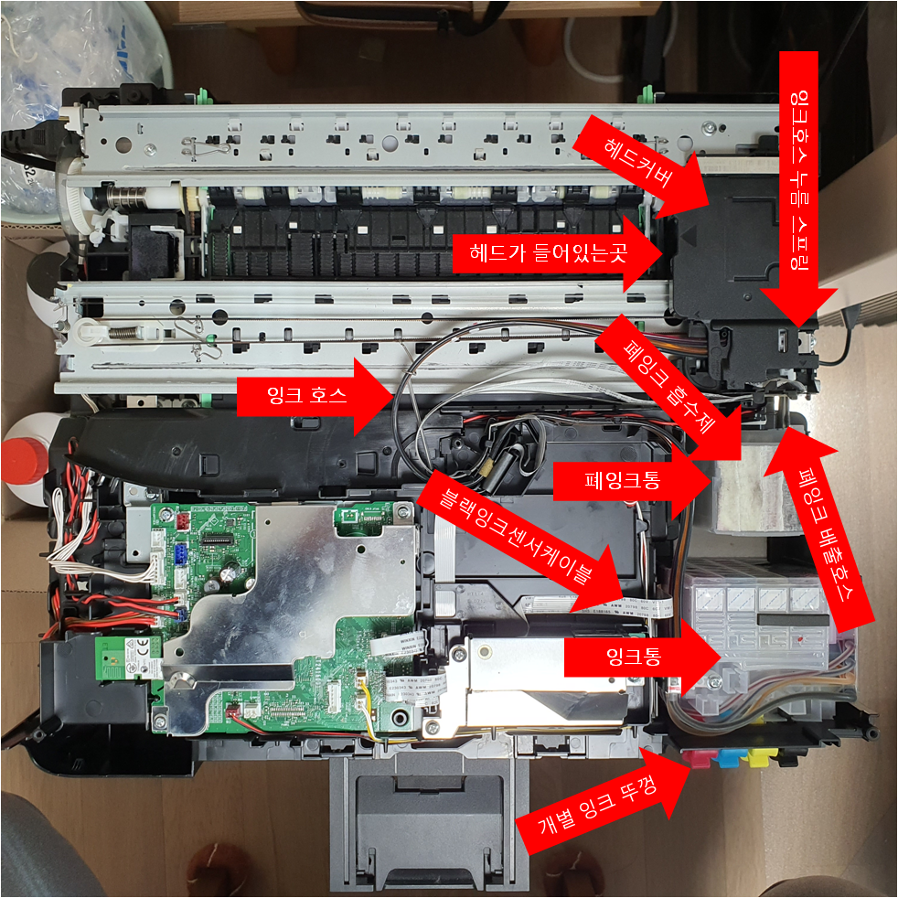 11. 나머지, 잉크통, 폐잉크통, 헤드, 잉크호스 이런 것은 목적에 따라 분해를 해야하기 때문에 다 뜯어낼 필요는 없다.
