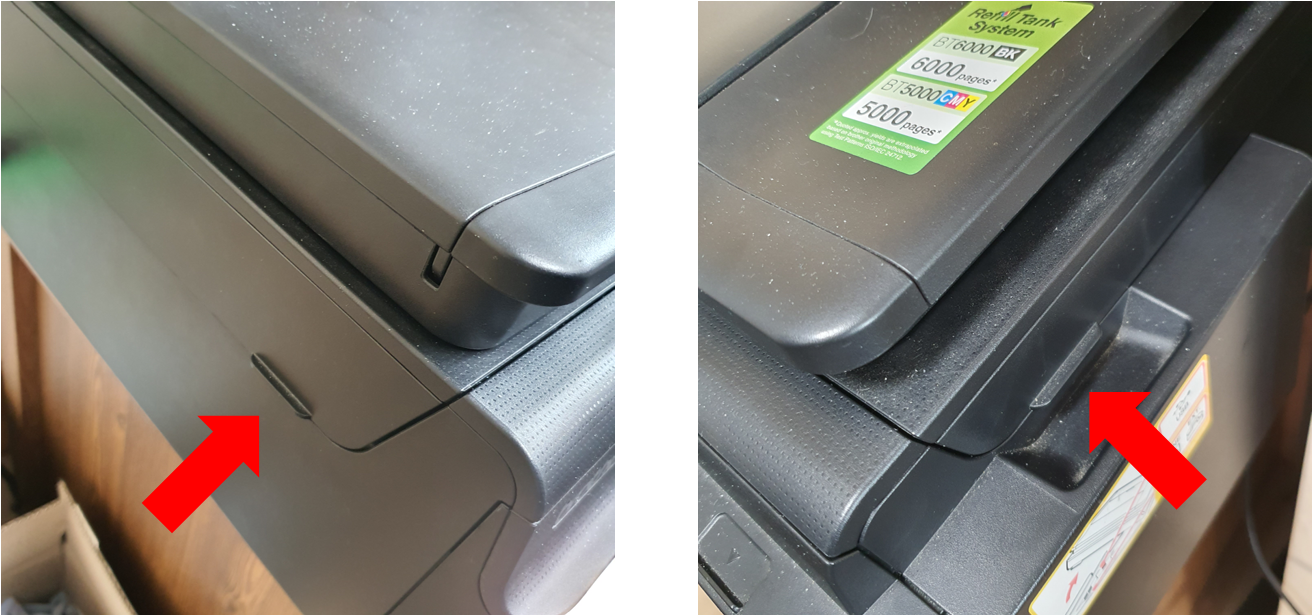 앞쪽을 들어 올린채로 프린터 뒤쪽 아래를 만져 보면서 커버와 본체가 물린 부분을 찾아서